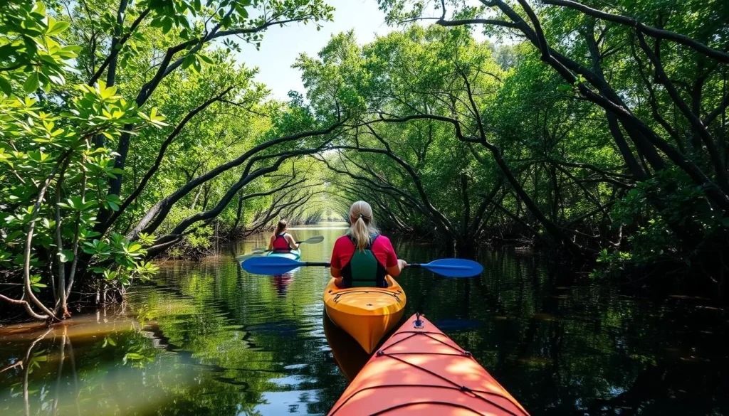 - Kayaking and paddleboarding through calm waterways and mangrove tunnels